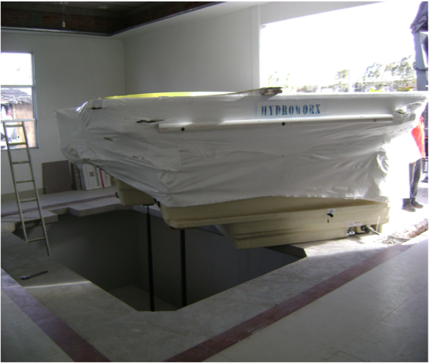 - Piscina 1200: 3.0 largo x 2.13 ancho x 2.62 mts profundidad; Peso con agua: 17.6 ton